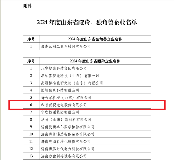 近日,山東省工業(yè)和信息化廳、中共山東省委金融委員會辦公室、中國人民銀行山東省分行公布2024年度山東省瞪羚、獨角獸企業(yè)名單。和普威視成功入選。